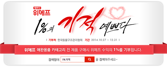 위메프 류재청 MD는 “한국동물구조협회와 MOU를 맺고 유기동물 보호에 힘쓰고자 ‘1%의 기적’ 행사를 마련했다”며 “내 반려동물을 위해 물건도 구매하고 유기동물도 도울 수 있는 좋은 행사에 많은 분들의 관심과 참여를 바란다”고 말했다.