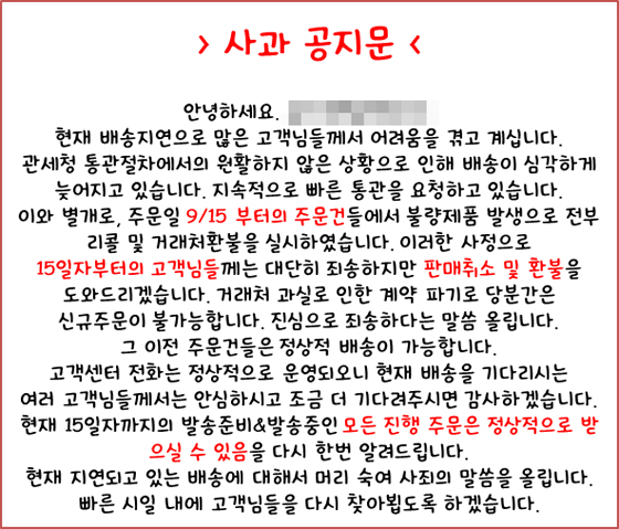 하지만 한 달이 지나도록 아무 소식이 없었고 그 사이 판매자는 제품에 문제가 생겨 9월15일까지 구매한 사람에게만 제품 배송이 되며 이후 구매자는 자동 취소된다는 공지를 올렸다.