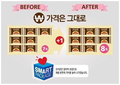 마켓오 리얼브라우니는 기존 7개입 제품에서 8개입으로 변경하고 대단한나쵸, 썬, 눈을감자는 포장 규격을 줄이고 내용물을 5%늘린다.