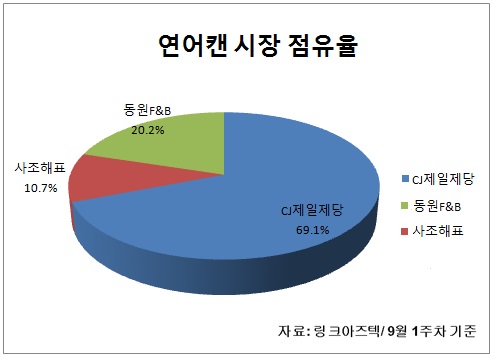 현재 연어캔 시장은 지난 9월 1주차 기준으로 CJ제일제당(대표 이해선)이 69.1%라는 압도적인 점유율로 시장을 선점한 상태다. 그 뒤를 동원과 사조해표(대표 이인우)가 각각 20.2%, 10.7%를 차지하고 있다.