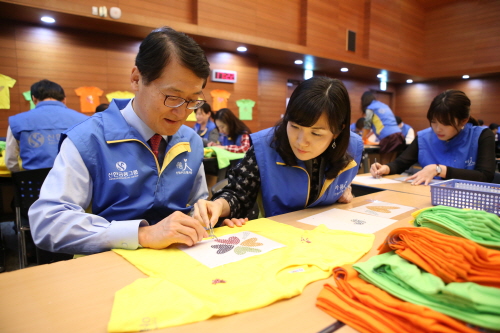 ▲위성호 신한카드 사장이 티셔츠에 장식을 붙이고 있다.