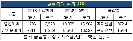 교보증권의 올해 2분기 영업이익은 130억 원으로 전년 동기 대비 흑자전환에 성공했다. 당기순이익 역시 85억 원을 기록, 흑자전환했다. 올 상반기기준으로는 영업이익이 169억 원으로 전년 동기 대비 372.4%, 당기순이익은 133억 원으로 154.4%나 급증했다.