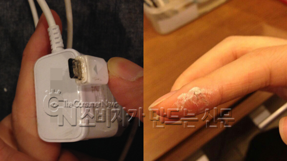 지난 10월15일 집 인근에 있는 커피숍에서 휴대전화를 충전하고 있던 박 씨는 충전기에 손을 대는 순간 뜨거운 기운이 올라와 깜짝 놀랐다. 발열로 인해 휴대전화 충전단자 부분과 충전기 모두 녹아 있는 상태였고 박 씨의 손 역시 화상을 입어 물집이 잡혔다.