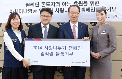 아시아나항공(대표 김수천)이 기아대책 본부에 필리핀 빈민 아동을 돕기 위한 '사랑 나누기 캠페인' 기부물품 전달식을 가졌다.
