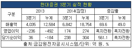17일 금융감독원 전자공시스템에 따르면 현대증권의 올해 1~3분기 매출액은 연결 재무제표 기준 1조8천754억 원으로 전년 동기 대비 49% 증가했다.