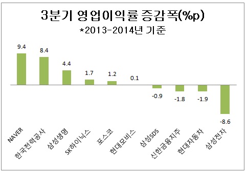 대한민국 대표기업인 삼성전자의 부진이 크게 영향을 끼친 가운데 포스코와 한국전력, 삼성생명 등은 지난해 같은 기간에 비해 수익성이 개선됐다.