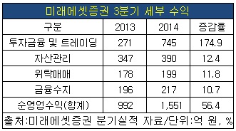 실제 미래에셋증권의 올해 3분기 순영업수익은 1천551억 원으로 전년 동기 대비 56.4%가 늘어났다.