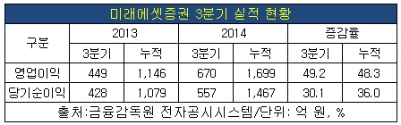 19일 금융감독원 전자공시시스템에 따르면 미래에셋증권의 올해 1~3분기 영업이익은 1천699억 원으로 48.3%가, 당기순이익 1천467억 원으로 36% 급등했다.