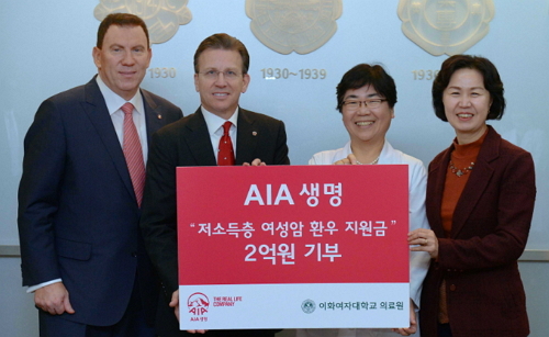 AIA생명은 24일 서울시 양천구 이대여성암병원 다목적실에서 저소득층 여성암 환우들의 암 극복을 위한 지원금 2억원을 이화여자대학교 의료원에 전달했다.