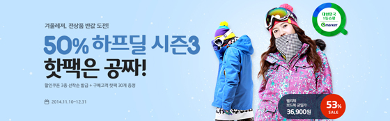 G마켓은 내달 31일까지 ‘50% 하프딜 시즌3, 핫팩은 공짜’ 프로모션을 진행한다. 오전 10시, 오후 1시, 4시 등 하루 세 번 50% 할인쿠폰과 15% 할인쿠폰을 선착순으로 증정한다. 주말에는 1만 원 이상 구매 시 사용 가능한 20% 할인쿠폰을 총 4만 장을 발급한다.