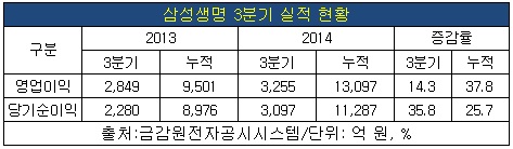 25일 금융감독원 전자공시시스템에 따르면 삼성생명의 올해 3분기 영업이익은 3천255억 원으로 전년 동기 대비 14.3% 증가했다. 당기순이익은 3천97억 원으로 전년 동기 대비 35.8%나 늘었다.