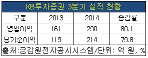 정사장의 활약으로 KB투자증권은 올해 3분기 영업이익이 290억 원으로 전년 동기 대비 80.1%나 늘어났으며 당기순이익 역시 214억 원으로 79.8%나 급등했다.