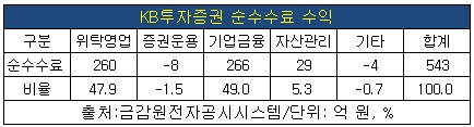 KB투자증권의 총 순수수료 수익은 543억 원이었는데 그 중 IB 부문 순 수수료 수익이 266억 원으로 49%를 차지하고 있다. 위탁매매 수수료 수익은 260억 원으로 47.9%, 자산관리 수수료 수익은 29억 원으로 5.3%를 기록 중이다.