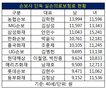 손해보험협회 공시에 따르면 단독 표준형(자기부담금 20%) 실손의료보험료를 판매하는 삼성화재(대표 안민수), 동부화재(대표 김정남), 현대해상(대표 이철영·박찬종), LIG손해보험(대표 김병헌), 메리츠화재(대표 남재호), 한화손해보험(대표 박윤식), MG손해보험(대표 김상성), 롯데손해보험(대표 김현수), 흥국화재(대표 조훈제), 농협손해보험(대표 김학현) 등 10개 손보사 중 남자 실손의료보험료가 가장 저렴한 보험사는 동부화재였다.