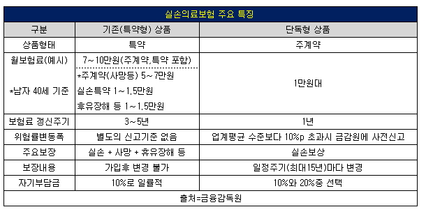 단독 실손의료는 기존 특약형 실손의료가 사망보장 등을 주계약으로 하면서 실손보장을 특약으로 추가해 보험료가 비싼 것과 달리 불필요한 보장에 가입할 필요가 없어 비교적 저렴하다는 특징이 있다. 또한 자기부담금이 기존 10%로 일률적이었던 것이 10%와 20% 중 선택할 수 있어 소비자 선택권이 확대됐다는 평가다.