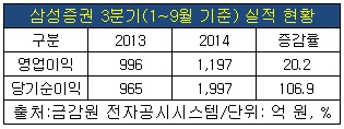 올 상반기까지만 해도 당기순이익이 467억 원에 그쳤던 삼성증권은 3분기까지 누적 당기순이익이 1천997억 원으로 전년 동기 대비 106.9%나 늘어났다. 이에 따라 올 상반기까지 당기순이익 1천29억 원을 기록했던 한국투자증권과 980억 원의 한국투자증권을 추월했다.