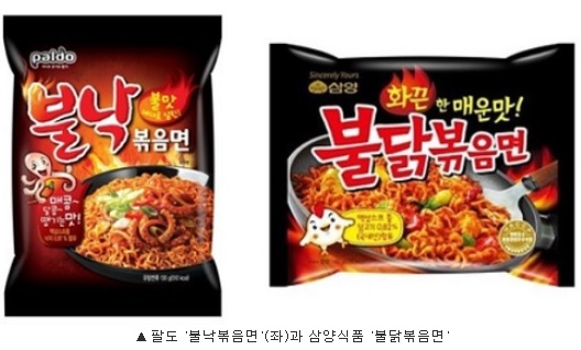 삼양식품은 지난 5월 팔도의 ‘불낙볶음면(2013년 11월 출시)’이 자사 ‘불닭볶음면(2012년 4월 출시)’을 표절했다며 판매 중지를 요구하는 사용중지 가처분 소송을 냈다.