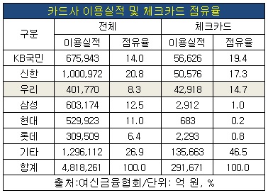 더불어 체크카드 시장에서 강세도 눈에 띈다. 우리카드의 올해 3분기 체크카드 이용실적은 4조2천918억 원으로 시장점유율은 14.7%로 전업계 카드사 중 1위 KB국민카드(대표 김덕수) 19.4%와 2위 신한카드(대표 위성호) 17.3%에 이어 3위를 기록했다.