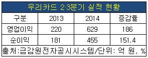 2일 금융감독원 전자공시시스템에 따르면 올해 2·3분기 우리카드의 영업이익은 629억 원을 기록했다. 지난해 분사 직후 6개월 동안 벌어들인 영업이익이 220억 원이었던 것에 비해 불과 1년 만에 3배 가까운 규모로 성장한 것이다.