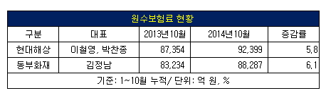 올해 10월말까지 원수보험료는 현대해상 9조2천399억 원, 동부화재 8조8천287억 원으로 4천112억 원의 차이를 보였다. 지난해 같은 기간에 비해 현대해상이 5.8%, 동부화재가 6.1% 증가하면서 두 회사의 차이가 소폭 감소했다.