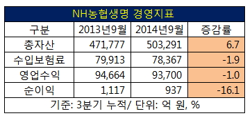 농협생명의 3분기 누적 영업수익은 9조3천610억 원으로 전년 동기 9조4천564억 원에 비해 1% 감소했다. 수입보험료가 1.9% 감소하면서 보험료 수익이 줄고 유가증권 평가이익이 감소했기 때문이다.