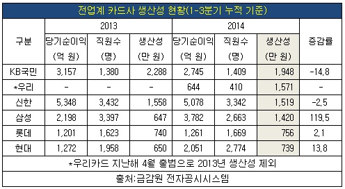 생산성 2위는 1천571만원의 우리카드였고 신한카드와 삼성카드가 1천519만원과 1천420만원으로 뒤를 이었다.