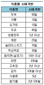 우유와 두부의 유통기한은 14일로 동일하지만 소비기한은 각각 45일, 90일로 늘어난다. 냉동만두는 유통기한이 9개월인데 잘 보관하면 1년 이상 지나 먹어도 괜찮다는 게 업계 설명이다. 포장판매 김치는 유통기한이 30일인 반면 소비기한은 6개월 이상으로 두 배다. 라면은 8개월까지 두고 먹을 수 있으며 참기름과 참치캔, 식용유는 각각 6개월, 3년 이상 소비기한이 늘어난다.