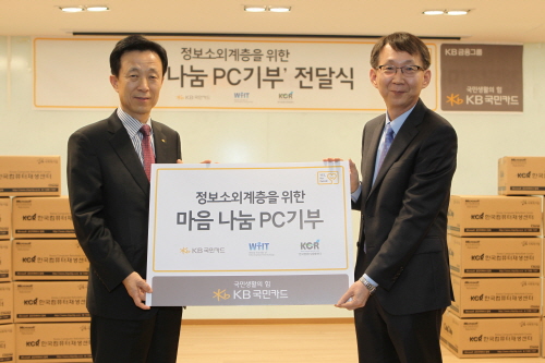 ▲KB국민카드 김덕수 사장(좌측)이 WTIT 김정중 이사장(우측)에게 마음나눔 PC를 전달하고 있다.
