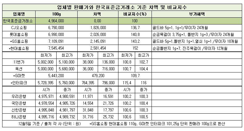 100g제품을 판매하는 롯데홈쇼핑은 표준금거래소에 비해 가격이 202만6천 원(40.8%) 높고 GS홈쇼핑(100g 환산가)도 214만5천 원(43.2%) 비싼 것으로 조사됐다. 가장 가격차가 적은 CJ오쇼핑도 표준금거래소에 비해 180만 원(36.7%)의 차이를 보였다.