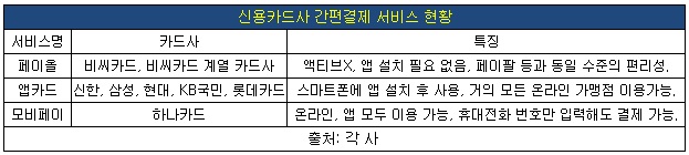 국내 전업계 신용카드사들도 국내 온라인 가맹점을 대상으로 공인인증서 의무적용 대상이 아니었던 소액결제에 대해 다양한 인증방식의 간편결제 서비스를 제공하고 있다.