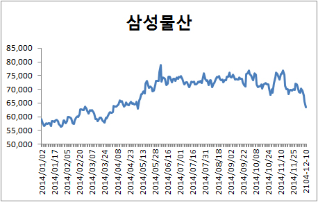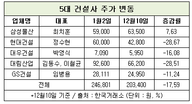 하지만 삼성중공업과 삼성엔지니어링 합병이 무산된 11월19일 이후 주가가 떨어지면서 12월10일 6만3천500원으로 장을 마쳤다. 그럼에도 올초에 비하면 7.6% 상승해 5대 건설사 가운데 유일하게 주가가 올랐다.