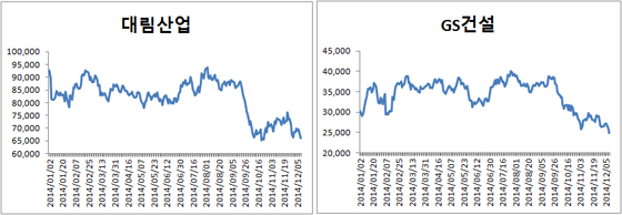 대림산업은 지난해부터 실적에 대한 우려로 인해 등락을 거듭하다가 최경환 효과로 지난 8월9만3천900원까지 올랐지만 3분기 해외 사업장에서의 부진으로 1천893억 원 영업적자를 발표하면서 10월21일 6만5천100원까지 30% 가까이 떨어졌다.