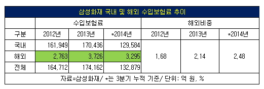 2011년 1천567억 원에서 2012년 2천763억 원으로 76% 증가했고 2013년에는 전년 대비 34.9% 증가한 3천726억 원을 기록했다. 전체 수입보험료에서 해외 매출이 차지하는 비중도 2011년 1.1%, 2012년 1.7%, 2013년 2.1%로 매년 증가하고 있는 추세다.