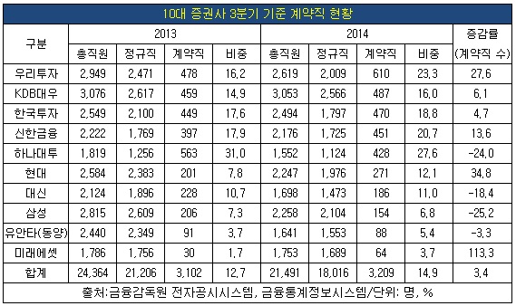 대신증권과 유안타증권의 경우도 계약직 수는 각각 18.4%, 3.3% 감소했으나 그 비중은 0.3%포인트, 1.7%포인트 증가했다.