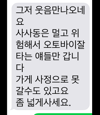 그러나 조금 후 본사 측 답변 대신 해당 매장에서 보낸 어이없는 내용의 문자메시지가 왔다. 김 씨의 집이 언덕이 많아 오토바이 잘 타는 사람만 간다는 설명과 함께 '그저 웃음만 나오네요', '좀 넓게 사세요'라는 비웃음이 가득한 내용이었다.