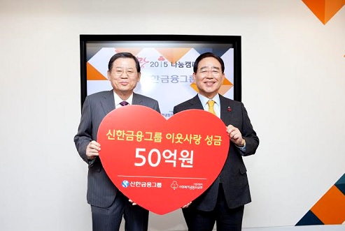 신한금융그룹(회장 한동우)이 15일 오전 서울시 중구 정동에 위치한 사회복지공동모금회(회장 허동수)를 방문해 이웃사랑 성금 50억 원을 전달했다.