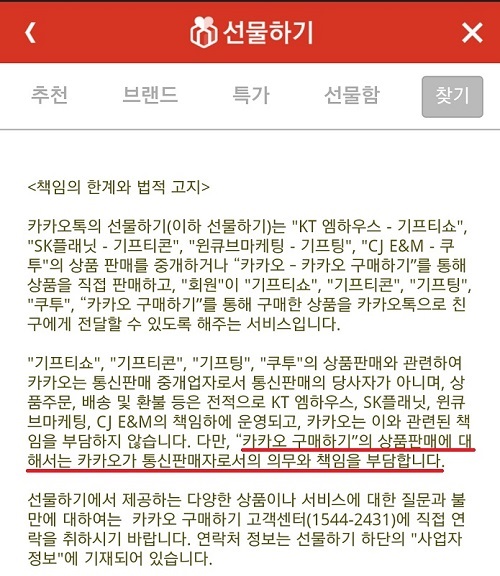 우선 기프티콘, 기프티쇼와 같은 모바일 상품권을 대행해서 판매하는 경우 카카오가 '통신판매 중개업자'로 분류돼 분쟁 발생시 직접적인 책임을 물을 수 없다.
