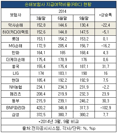 16일 전자공시시스템에 따르면 악사손해보험의 지급여력비율은 지난 9월말 기준 130.4%를 기록했다. 이는 조사 대상 14개 손보사 가운데 가장 낮은 수치이다. 지난 3월말 152.8%에 비해서는 18%포인트나 하락했다.