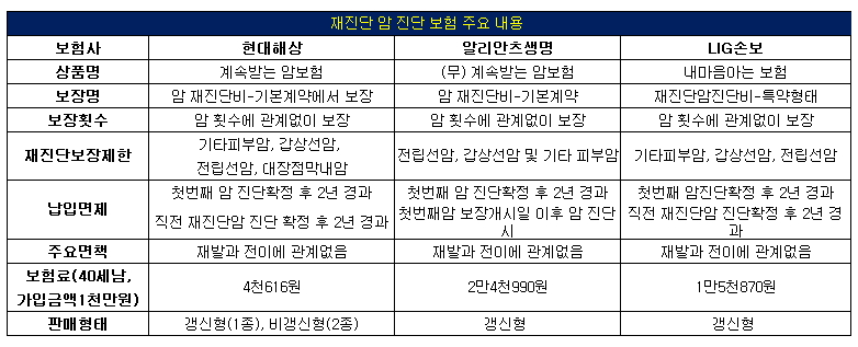 현대해상과 알리안츠생명에서 판매하는 '계속받는 암보험'은 주계약에 암진단비와 재진단비를 포함하고 있다. 반면 LIG손보는 특약형태로, 라이나생명은 기존 상품에 특약 상품을 추가하는 형태로 선보이고 있다.