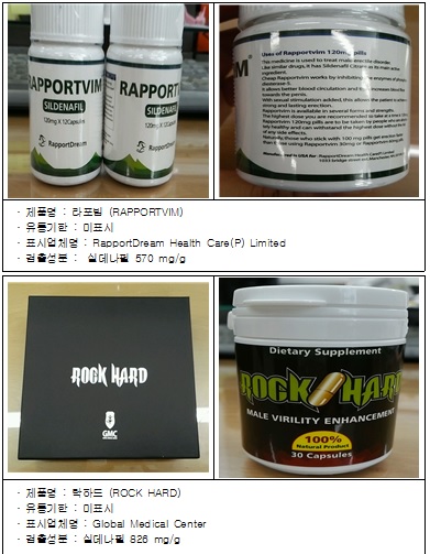 ‘라포빔(RAPPORTVIM)’과 ‘락하드(ROCK HARD)’는 실데나필이 각각 570mg/g, 826mg/g이나 검출됐다. ‘맨파워 365(MAN POWER 365)'와 ‘파극천’은 타다라필이 각각 25.2mg/g, 24.5mg/g 검출됐다.