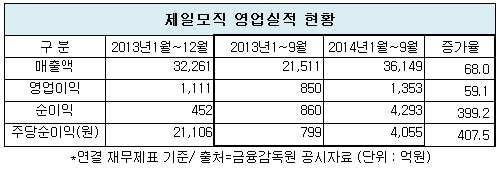 또 제일모직은 지난 9월말 기준으로 자기자본이 4조4천억 원에 달하지만 순이익은 4천억 원으로 11배 가량 차이가 난다.