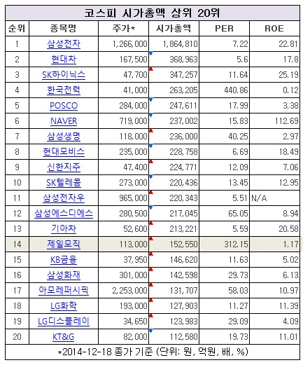실제로 제일모직은 공기업인 한국전력공사을 제외한 시총 상위 20개사 가운데 주당수익비율(PER)이 312.15배로 가장 높다. 반면 자기자본수익률(ROE)은 1.17%로 가장 낮다.