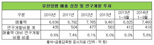 매출은 늘었지만 상대적으로 연구개발 투자는 주춤한 상황이다. 유한양행은 2010년 매출대비 연구개발 비중이 6.6%였고, 이듬해 7.4%로 상승한 이후 6%대 초반에 머무르고 있다.