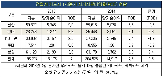 신한카드는 ROE가 지난해 같은 기간에 비해 0.5%포인트 떨어졌지만 1위를 지켰다. 순이익이 5천348억 원에서 5천78억 원으로 줄어든 것이 ROE 하락으로 나타났다.