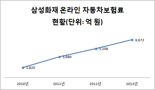 삼성화재는 2009년 온라인 자동차보험 영업을 시작할 당시 연간 매출(원수보험료)이 573억 원에 불과했다. 하지만 2010년 1천820억 원, 2011년에 3천680억 원, 2012년 5천108억 원, 2013년 6천672억 원으로 매년 두자릿 수 비율 증가했다.