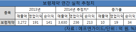 에프앤가이드에 따르면 보령제약의 올해 예상 매출액은 3천630억 원으로 지난해에 비해 10% 증가할 것으로 예상됐다.