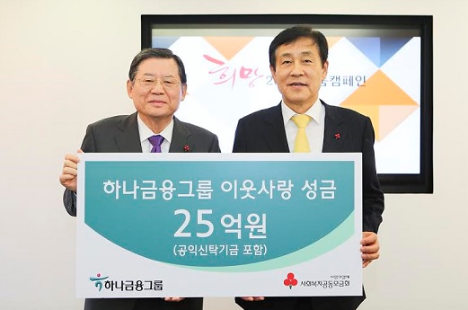 하나금융그룹(회장 김정태)이 23일 사회복지공동모금회(회장 허동수)에 이웃돕기 성금 25억 원을 기탁했다.