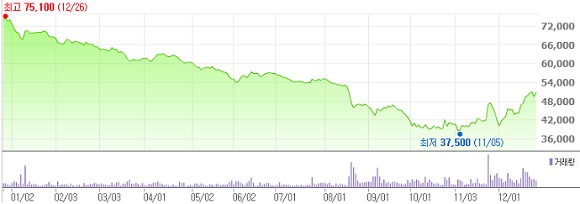 지난해 12월 26일 7만5천100원으로 정점을 찍었던 것에 비하면 1년새 32.5%나 하락했지만 지난달 5일 장중 한 때 3만7천500 원까지 떨어졌다가 3만8천750원으로 마감된 것에 비하면 30.8%나 상승했다. 유가하락으로 실적이 악화되면서 줄곧 내리막을 타던 주가가 연말 들어 다시 상승곡선을 그리는 중이다.