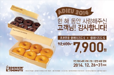 '아듀 2014' 프로모션은 던킨도너츠 '초코우유 글레이즈드' 6개와 '글레이즈드' 6개를 한 세트로 구성해 7천900원에 할인 제공하는 이벤트.
