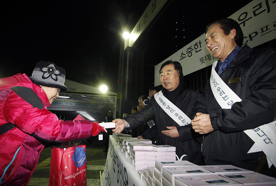 이날 현장에는 롯데물산을 비롯한 관계사 임원들도 전원 참석해 ‘소중한 당신, 우리는 당신을 믿습니다’라는 어깨띠를 매고 떡을 함께 전달했다.